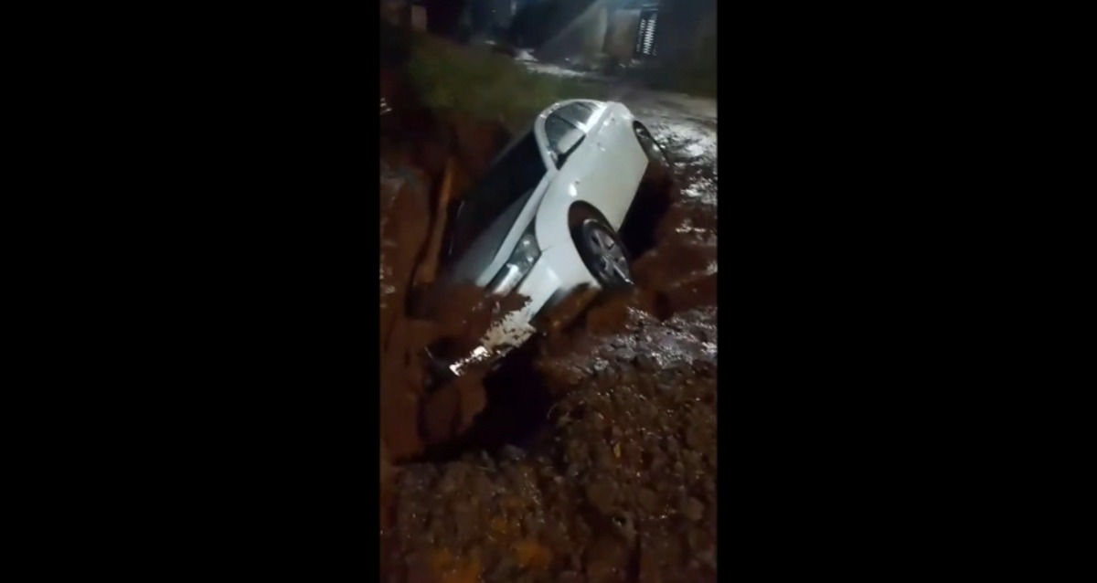 O forte temporal que atingiu Campo Grande nesta terça-feira (7) causou prejuízos severos e deixou motoristas em alerta. Na região do bairro Ramez Tebet, um veículo caiu em uma cratera aberta pela força das águas na Rua Fidélis Bucker. Imagens do local mostram o carro danificado dentro do buraco, que não possuía sinalização no momento do incidente, evidenciando o perigo para quem trafegava pela via durante a chuva.